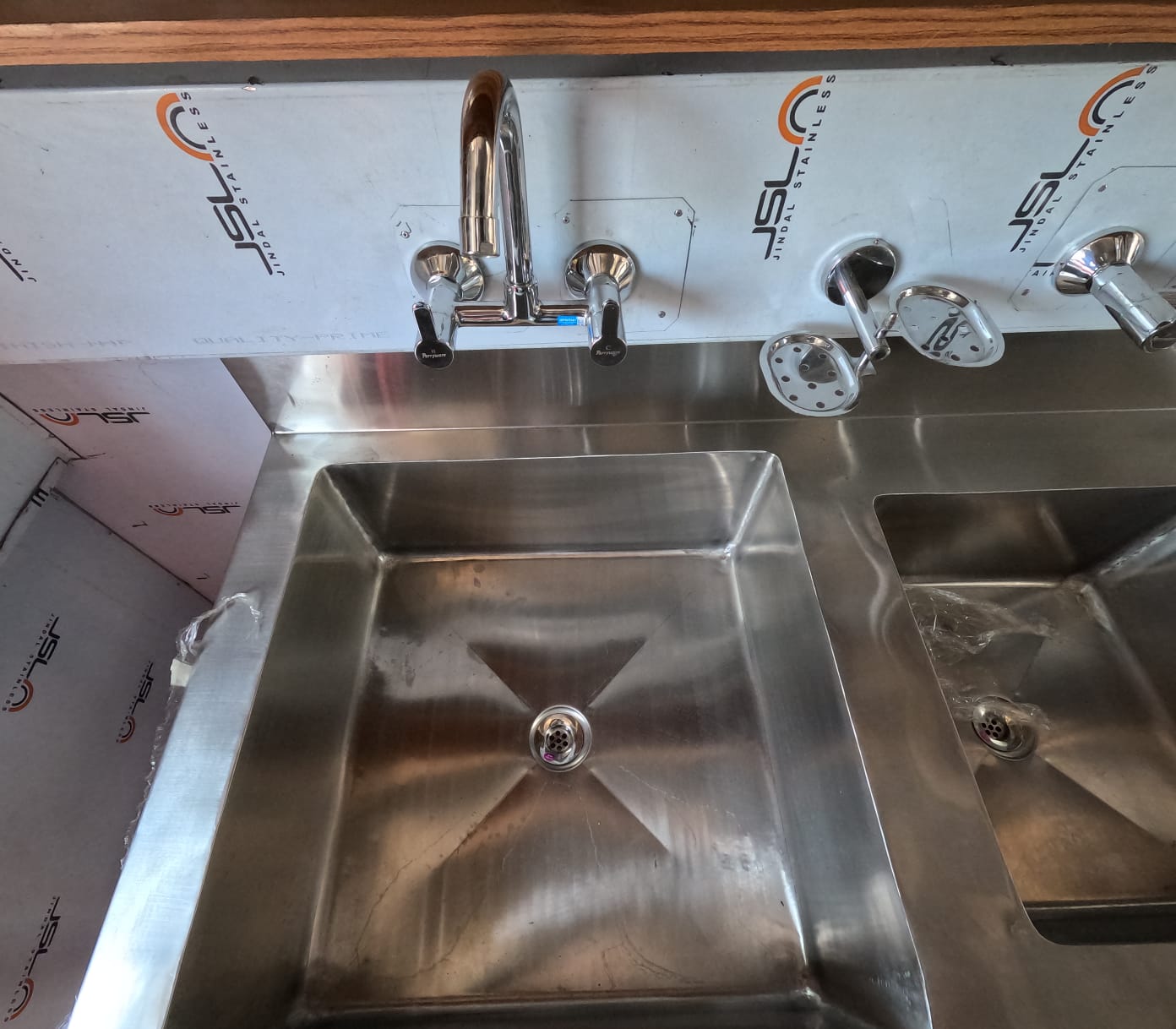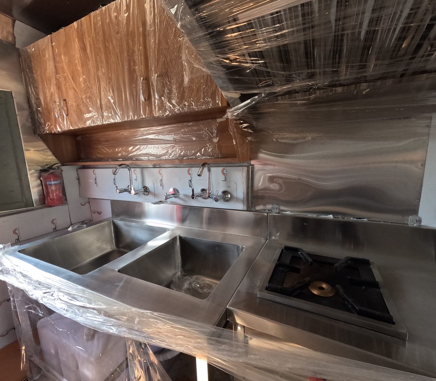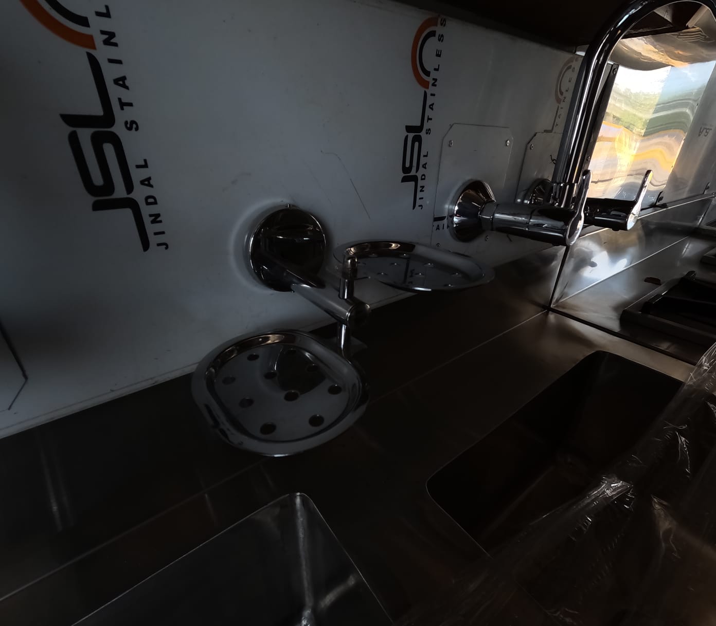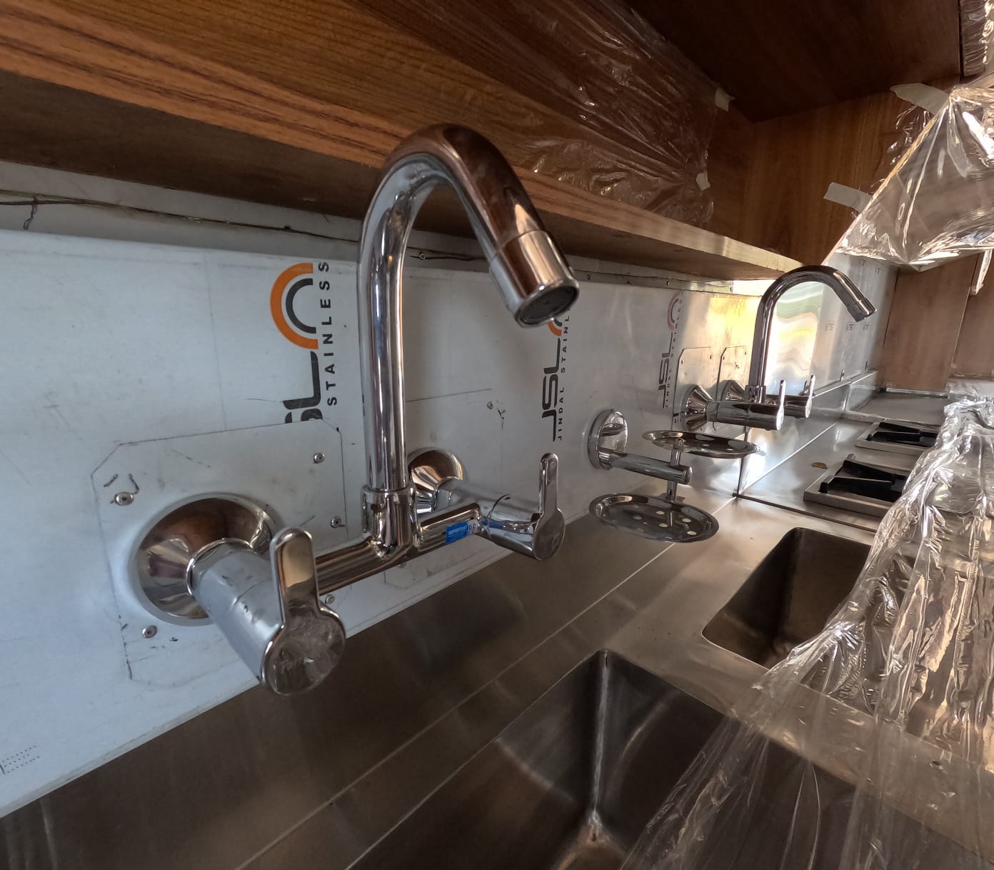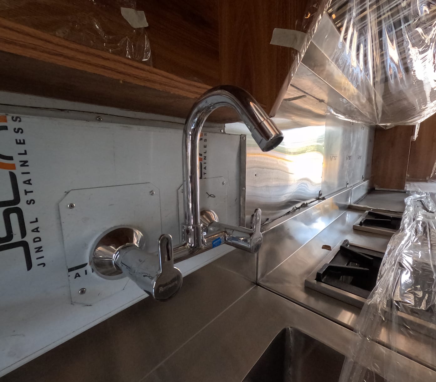 Comprehensive Water System: 1000L overhead water tank, 200L RO tank, hot/cold water dispensers and sinks.